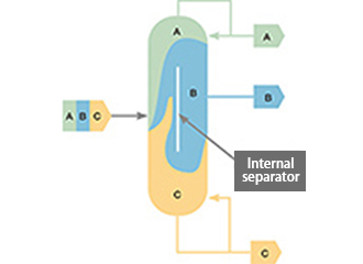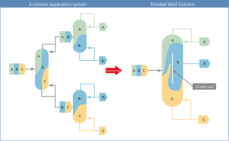Kami mengembangkan Column-In-Column yang mampu menyediakan sistem distilasi hemat energi untuk proses pemisahan multikomponen. Jika dibandingkan dengan sistem kolom konvensional yang membutuhkan banyak kolom untuk pemisahan multikomponen, sistem CIC kami dapat menyederhanakan aliran proses dan mengurangi jumlah peralatan, energi, ruang, perpipaan, instrumentasi, dll, sehingga mampu secara efisien mengurangi biaya operasional.