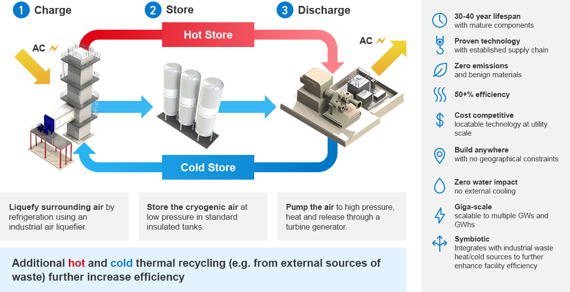 Teknologi Liquid Air Energy Storage (LAES) memanfaatkan sumber daya yang tersedia secara bebas - udara - yang didinginkan dan disimpan sebagai udara cair. Saat energi dibutuhkan, udara cair dapat diubah kembali menjadi gas bertekanan untuk menggerakkan turbin yang menghasilkan listrik. Sistem LAES sangat ideal untuk menggantikan pembangkit listrik berbasis bahan bakar fosil dengan menyediakan penyimpanan jangka panjang dalam renewable power systems. Teknologi ini selain menawarkan keseimbangan pasokan-permintaan yang hemat biaya, juga berkontribusi pada stabilitas jaringan, inersia, dan daya reaktif.