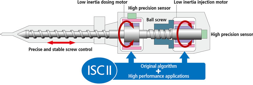Control system terbaru ISCII (Intelligent Servo Controller II) dapat mengontrol servo motor inersia rendah yang dikembangkan secara internal. Selain itu, sistem juga memungkinkan kontrol sekrup dengan presisi tinggi dan sangat responsif sehingga mampu menyediakan proses plastisisasi, pengisian, dan penahan tekanan yang lebih presisi dan stabil.