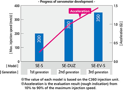 Direct drive system yang kami kembangkan dapat secara langsung mengomunikasikan gerakan yang diperlukan tanpa melalui speed reducing device yang tidak diperlukan di antara motor servo dan aktuator. Sistem penggerak tersebut terus kami kembangkan seperti dengan meningkatkan momen inersia yang rendah serta peningkatan kecepatan, dan saat ini sistem tersebut sudah memasuki generasi ketiga.