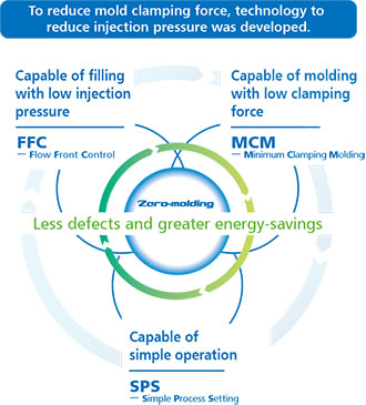 Zero-molding adalah integration application yang dapat menghindari/menghilangkan peluang terjadinya cacat, kerugian, dan kesalahan dengan sebaik mungkin. Aplikasi ini terdiri dari tiga elemen utama yaitu MCM (mold clamping-related technology), FFC (filling-related technology), dan sistem SPS yang bisa dengan mudah mengoperasikan teknologi tersebut.