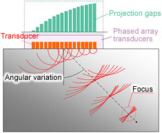 Konsep dasar phased array Dapat memfokuskan gelombang ultrasonik ke kedalaman yang diinginkan dengan pengaturan waktu transmisi dari transduser yang tersusun secara linear. Selain itu mampu meningkatkan penerimaan gelombang dari kedalaman tertentu, dengan menghitung perbedaan waktu dari penerimaan gelombang setiap transduser.