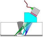 Pada saat melakukan pemeriksaan garis las, pertama-tama pemindaian elektron dilakukan dari arah tegak lurus dari garis las, lalu pemindaian secara manual dengan menggeserkan probe ke arah sejajar garis las, dengan begitu dapat menyimpan bentuk gelombang dari pitch pemindaian elektron x pitch arah X dalam bentuk data digital. Dengan memproses data bentuk gelombang, dapat mendapat gambar permukaan yang diinginkan atau gambar cacat (B-Scope, C-Scope atau D-Scope), dapat juga membaca koordinasi echo tempat defect maupun echo bentuk yang diinginkan.
